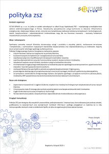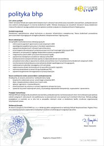 Gwarancją wysokiej jakości wytwarzanych produktów oraz terminowo i kompleksowo realizowanych usług przy zapewnieniu bezpieczeństwa ludzi oraz dbałości o ochronę środowiska naturalnego jest Zintegrowany System Zarządzania zgodny z normami: PN-EN ISO 9001:2015, PN-EN ISO 14001:2015,